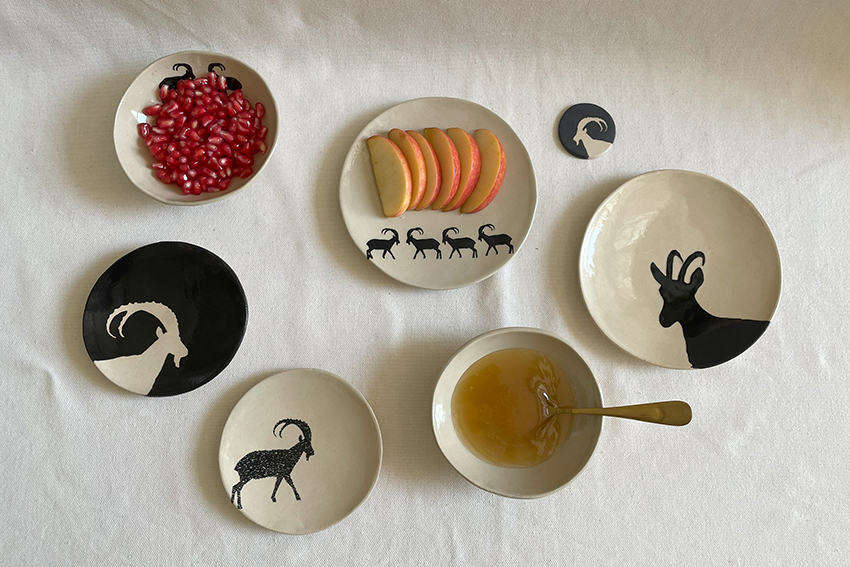 מארז כלים למרכז שולחן עם הדפסי יעלים. הכלים עשויים מקרמיקה בעבודת יד, כל פריט יחיד ומיוחד.